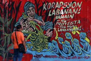 A MAN looks at a mural with an anti-corruption message in Quezon City, Sept. 20. — PHILIPPINE STAR/MIGUEL DE GUZMAN