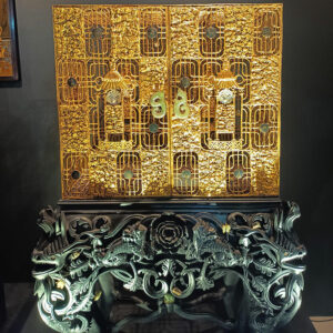 While her jewelry was all over the museum’s third floor, so were large carved tables and lamps, made with the same intricacy as her jewelry. Think of a piece called The Chase: a chest of kamagong wood which has metal handles shaped like lizards, all in different positions. It turns out they were all “chasing” a bejeweled insect found within one of the drawers. Then there is a piece called Gilded Cage which lies on a sculpted base of water serpents, surrounded by Asian motifs like peonies and Chinese lions — they all support a copper and wire cage with painted miniatures from the Boxer Codex, while tiny jade ornaments hang all over it.