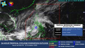 Meanwhile, Tropical Depression Verbena was last located over the coastal waters of Magsaysay, Palawan, the Philippine Atmospheric, Geophysical, and Astronomical Services Administration (PAGASA) said in its latest advisory.