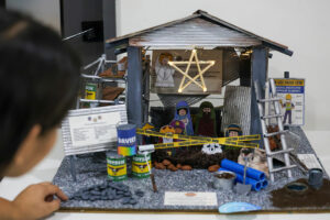 A FLOOD CONTROL–THEMED nativity scene is displayed among the entries in the Belen Making Contest at the MBC Media Group building in Pasay City, Dec. 13. — THE PHILIPPINE STAR/NOEL B. PABALATE