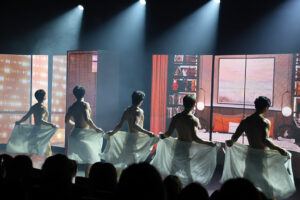 The show’s climax was announced: a wedding scene, where a lucky audience member drawn from a raffle went onstage, to be “married” to one of the Man Alive men, dressed in white. The rest of the group, in red suspenders and jumpsuits, guided the pair to a leather hammock. On the hammock, the “groom” bucked and grinded on his “bride,” then took off his pants, revealing slick vinyl underwear.