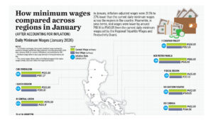 In January, inflation-adjusted wages were 21.5% to 27% lower than the current daily minimum wages across the regions in the country. Meanwhile, in peso terms, real wages were lower by around P91.16 to P149.05 from the current daily minimum wages set by the Regional Tripartite Wages and Productivity Board.