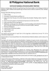 EconomyInvesting Philippine National Bank’s Annual Stockholders’ Meeting to be held on April 28 via remote communication by March 30, 2026 March 30, 2026 2 [#item_full_content] previous post What to Do on Holy Week next post AyalaLand Logistics Holdings Corp. to hold virtual Annual Stockholders’ Meeting on April 23 Related News Fuel price crisis risks pushing small firms to... March 30, 2026 Car finance redress bill cut by £2bn as... March 30, 2026 Iran war drives up costs and disrupts supply... March 30, 2026 Peso hits new low P60.69 vs dollar March 30, 2026 Slow growth to keep BSP on hold despite... March 30, 2026 Back to WFH? Oil crisis reignites debate over... March 30, 2026 Debt service bill jumps in January March 30, 2026 DoE says 900,000 barrels of diesel to arrive... March 30, 2026 Petron turns to Russian oil, secures 2.48 million... March 30, 2026 MTerra Solar starts exporting power to grid March 30, 2026